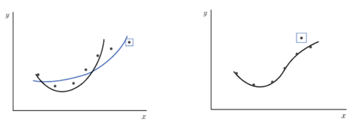 오른쪽 그래프는 샘플 데이터에 너무 집착한 모습임.